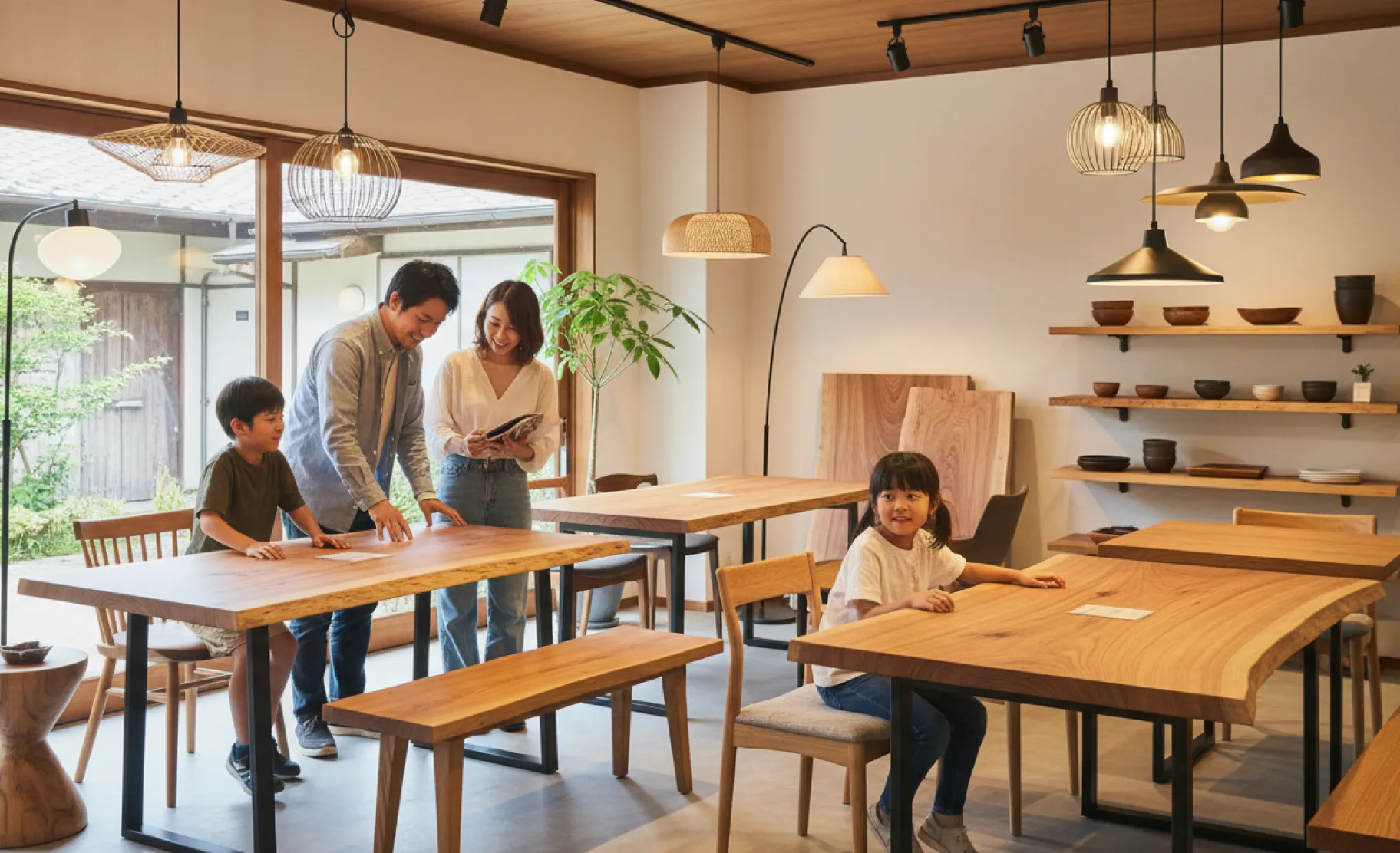 北米産のウォールナットをはじめ、世界各地の銘木や、日本の檜・杉といった国産材を用いた無垢の一枚板家具を展示・販売いたします。